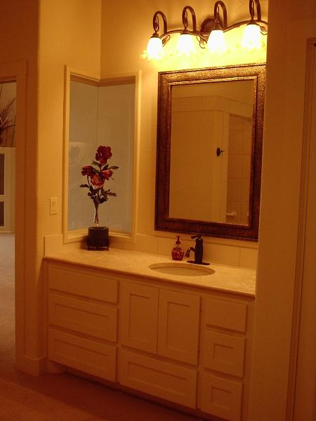The addition of the corner glass at the vanity not only adds